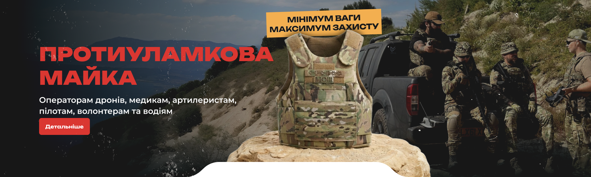 Захист: бронежилети, каски, захисні окуляри, рукавиці, наколінники, бронепліти, балістичні пакети та багато іншого.