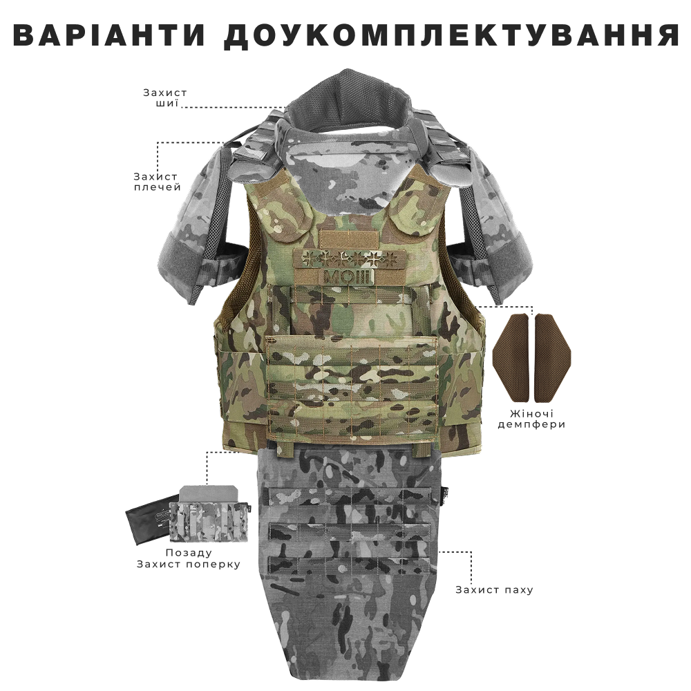 - Модульний захист: базова версія майки вже пропонує значний рівень захисту. Проте, для тих, хто прагне максимальної безпеки, передбачена можливість доукомплектувати її додатковим захистом шиї, плечей, паха та попереку. Це дозволяє адаптувати рівень захисту до конкретних умов та потреб вашої місії.